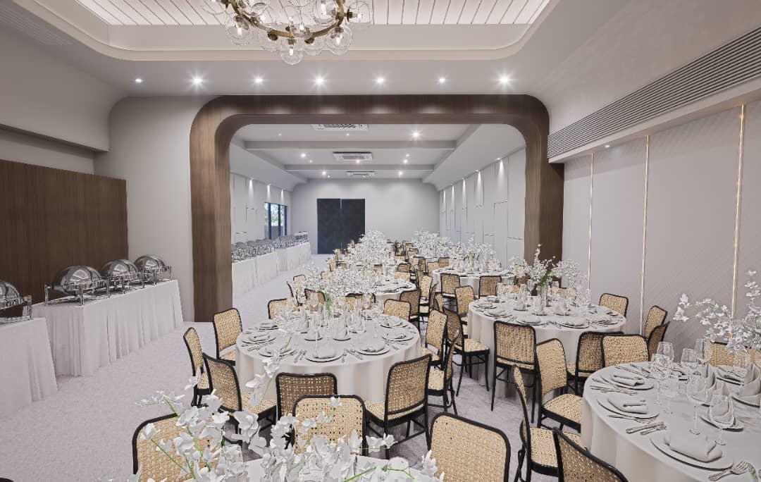 Will start with the facade. On the right we will have a permanent stall for your goreng-goreng panas food like kuay teow goreng, keropok lekor (our wedding package includes this), goreng ayam panas – panas etc. There will be trees to soften the look and also seating area just perfect to mingle – mingle during your event. Opening in April 2026, our redesigned venue is perfect for: